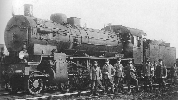 Lokomotiven im Kriegseinsatz. Die P8 "Essen 2410" mit Militärangehörige im Jahre 1914.