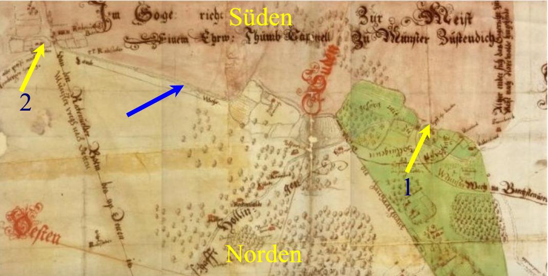 Karte von 1597.Oben, ist auf dieser Karte, der Süden! Pfeil in gelb mit der Nummer 1: Lintel, Pfeil in gelb mit der Nummer 2: Micheel. Blauer Pfeil: Der Verlauf der Landwehr von Micheel bis Lintel. Weitere Erläuterungen zu der kompletten Karte, dazu, hier! Quelle: Staatsarchiv NRW, Münster. |