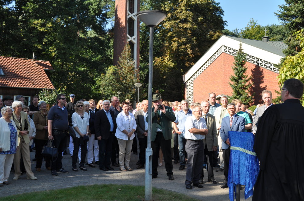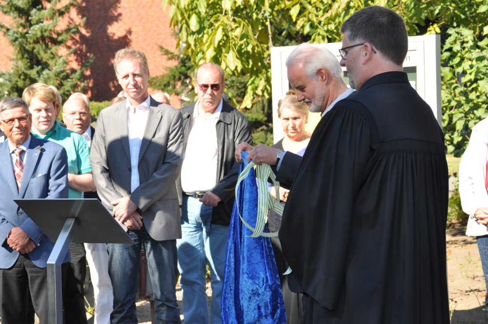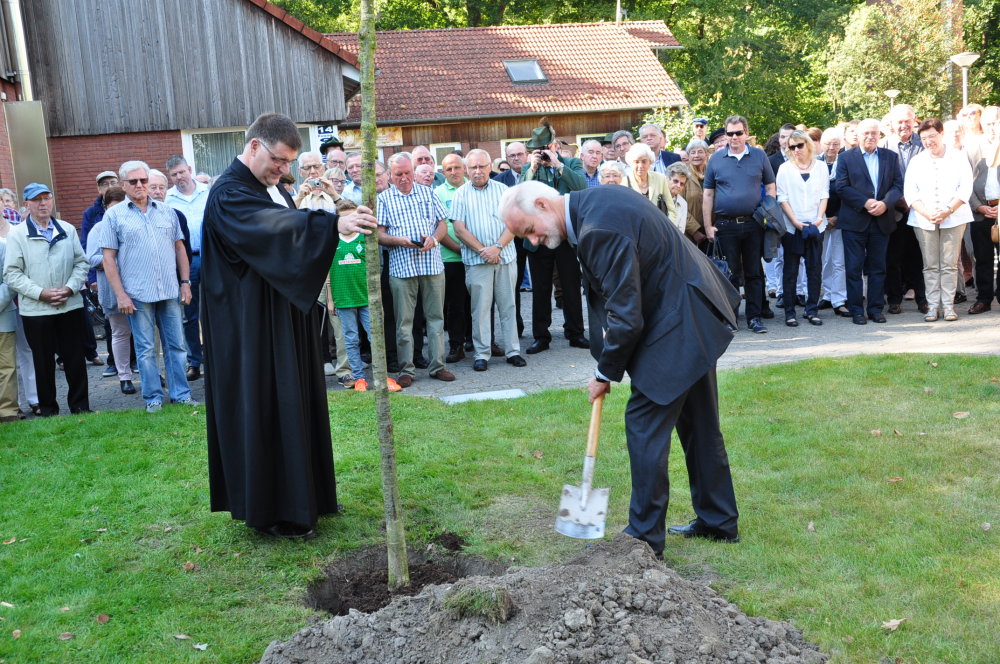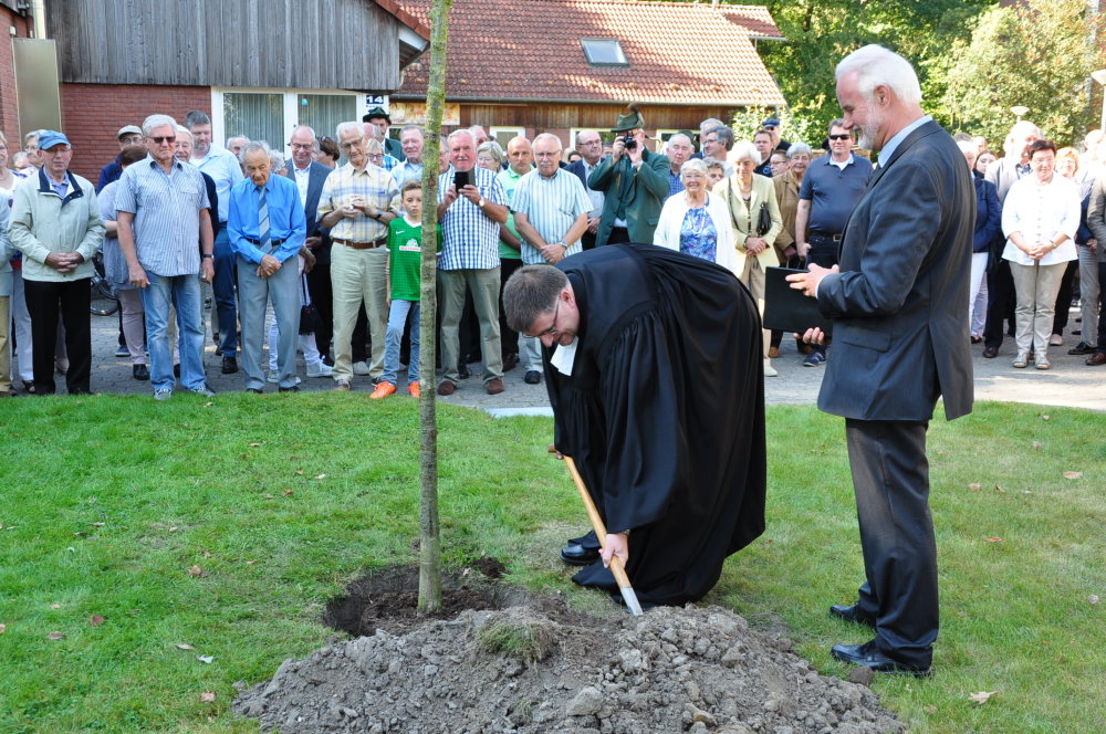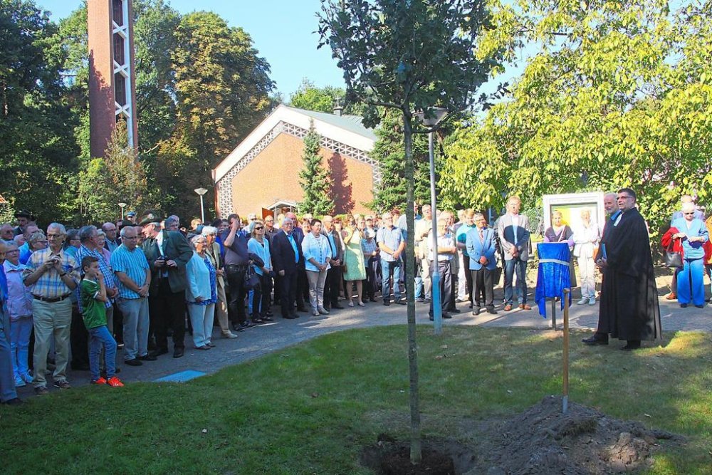 Es folgen Schnappschüsse aus dem Gottesdienst, der Enthüllung der Gedenktafel als auch das Pflanzen einer Friedenseiche.