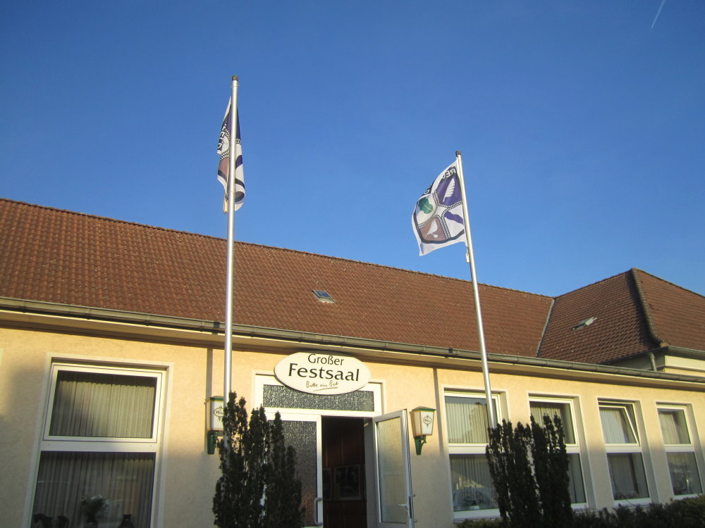 Zwei Fahnen mit dem Reckenfelder Wappen zierten den Eingang zum Deutschen Haus. |
