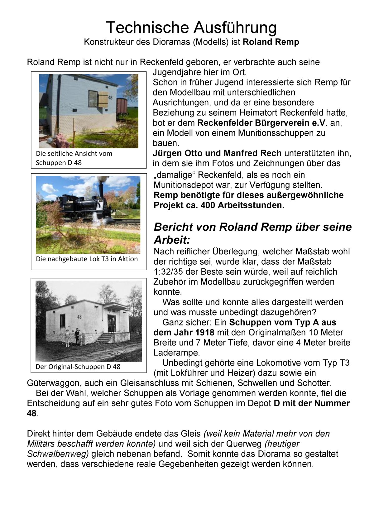 Es folgen Texte von Roland Remp und Manfred Rech über Einzelheiten zu dem Diorama eines Schuppens (Typ A). Technische Gegebenheiten wie Blitzableiter, Schienen, Schotter, Schwellen, Lokomotive und Güterwaggon etc. wurden integriert. Die Textbeiträge: