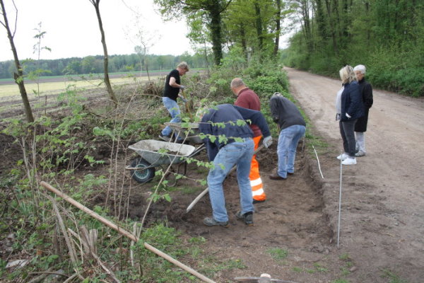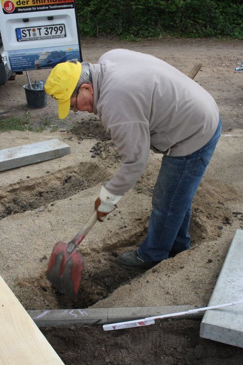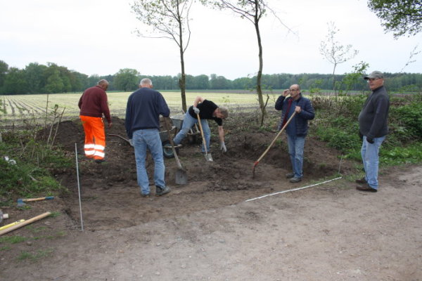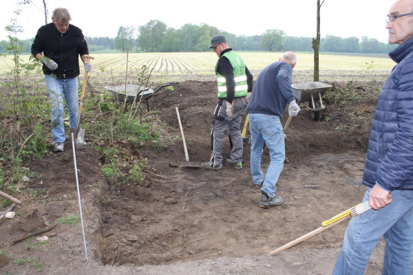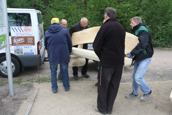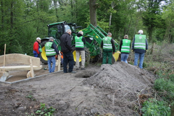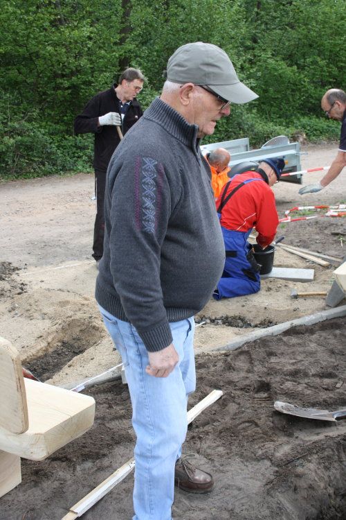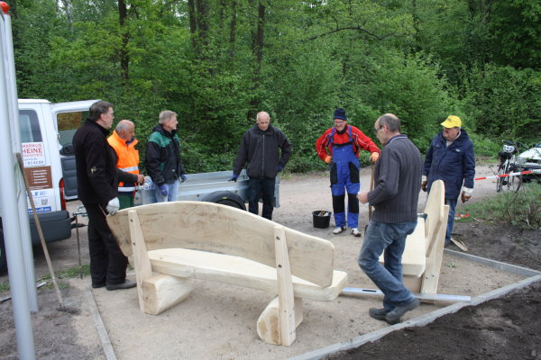 Zu b): Die nächsten Maßnahmen stand an: Die Sitzgruppe (sie wurde gesponsert) anfertigen zu lassen, aufzustellen und auch den Grenzstein in Höhe der Sitzgruppe zu platzieren. Alles auf Nordwalder Gebiet. Deshalb stand vom Bauhof Nordwalde der in Reckenfeld wohnende Andre Göcke zur Verfügung. Insgesamt konnten für diese umfangreichen Arbeiten ausreichend Reckenfelder gefunden werden und so war sichergestellt, dass das Ganze auch was werden würde: