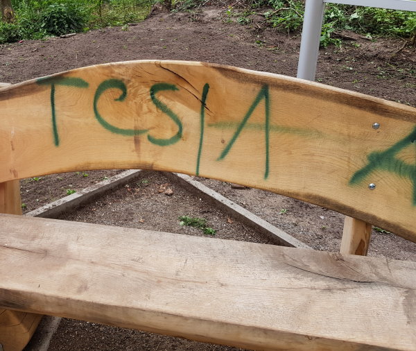 weil, ja weil bereits im Juli 2020 - also zwei Monate nach der Eröffnung - Raubauken am Werk waren. Sie beschmierten Bänke und Grenzstein und schossen wohl mit einer Flinte auf des befestigte Schild am Grenzstein.