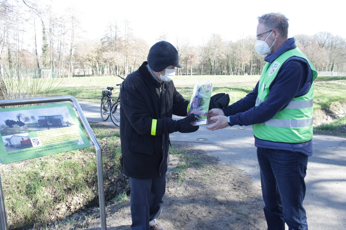 Klaus Schwenken überreicht dem 90-jährigen Karl Heinz Sandbaumhüter ein Präsent für seine Idee, dass ein solcher Hinweis auf das Diorama gegeben wird. |