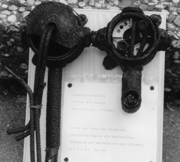 Firtzlaff schreibt: "Installationsteile von der E-Anlage aus einem Schuppen: Rohre und Dosen aus Flußstahl, getränktes Papier als Auskleidung, Klemmring mit selbstsichernden Klemmen. NCA AL 1,5mm (Anmerkung: NCA 1,5mm2 AL: Genormte gummiisolierte Aderleitung 1,5mm2 Aluminium).