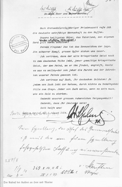 Aufruf des Kaisers an Heer und MarineDie Übersetzung:An das deutsche Heer und die deutsche Marine. Nach dreiundvierzigjähriger Friedenszeit rufe Ich die deutsche wehrfähige Mannschaft zu den Waffen. Unsere heiligsten Güter, das Vaterland, den eigenen Herd gilt es gegen Überfall zu schützen Feinde ringsum! Das ist das Kennzeichen der Lage. Ein schwerer Kampf, große Opfer stehen uns bevor. Ich vertraue, dass der alte kriegerische Geist noch in dem deutschen Volke lebt, jener gewaltige kriegerische Geist, der dem Feind, wo er ihn findet, angreift, koste es was es wolle, der von jeher die Furcht und der Schrecken unserer Feinde gewesen ist. Ich vertraue auf Euch, Ihr deutschen Soldaten! In jedem von Euch lebt der heisse, durch nichts zu bezwingende Wille zum Siege. Jeder von Euch weiss, wenn es sein muß, wie ein Held zu sterben. Gedenkt unserer grossen ruhmreichen Vergangenheit! Gedenkt, dass Ihr Deutsche seid! Gott helfe uns! Berlin, Schloß, den 6. August 1914. Wilhelm. Handschriftlich: Seine Excellenz, der Chef des Generalstabes, ist mit der von Euerer Excellenz festgesetzten Fassung einverstanden. Quelle: Reichsarchiv Berlin |