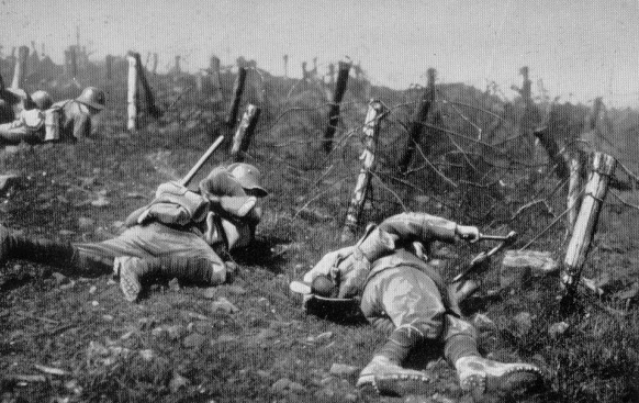 Deutsche Soldaten schneiden Drahthindernis durch. 1916