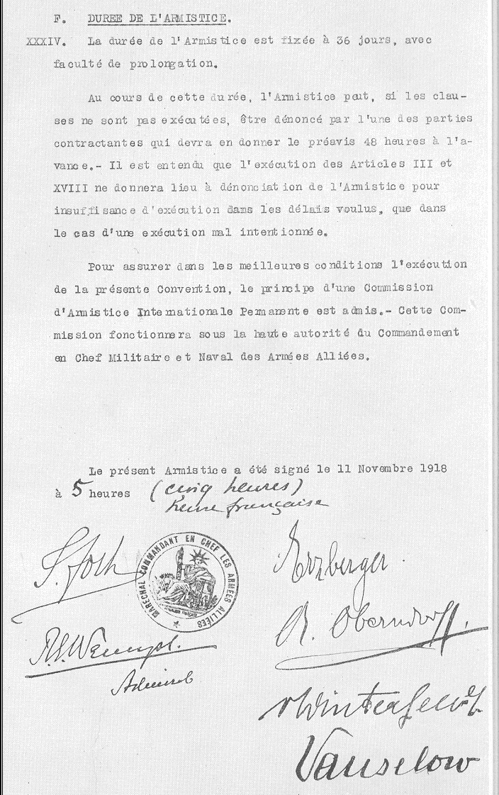 Die Waffenstillstandsurkunde vom 11. November 1918. Die Verhandlungen fanden ohne den Deutschen Kaiser statt.