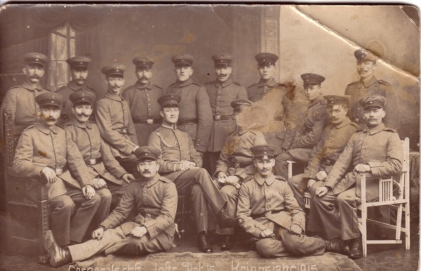2. von links: Josef Beckermann, Stiefvater von Änne B. Josef (Joseph) schickte am 4.4.1915 an seinen Bruder Richard Beckermann von Friedrichsfeld bei Wesel eine Karte nach Hause, Beckermann, in Greven, Bauerschaft Herbern Nr. 1.