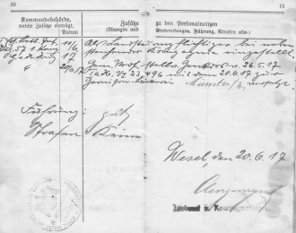 ![]() Das stellv. Generalkommando stellte dem Landsturmpflichtigen Anton Holthaus ein gutes Zeugnis in dem Militärpaß aus.