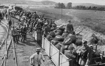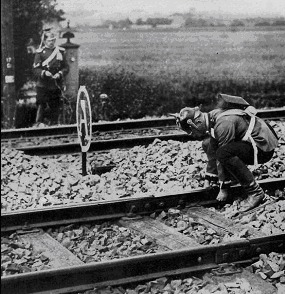 ![]() Deutsche Soldaten präparieren eine Einsenbahnstrecke.