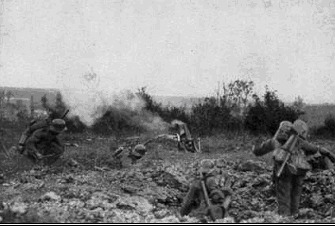 ![]() Der Augenblick des Angriffes mit Handgranaten und Minenwerfern auf einen feindlichen Graben, der sich hinter dem Gebüsch entlang zieht.