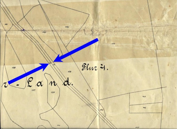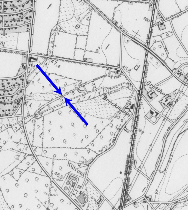 Die Pfeile zeigen auf die von Berkenheide (Wittlerdamm) zur Kreisstraße nach Greven laufende Landwehr
