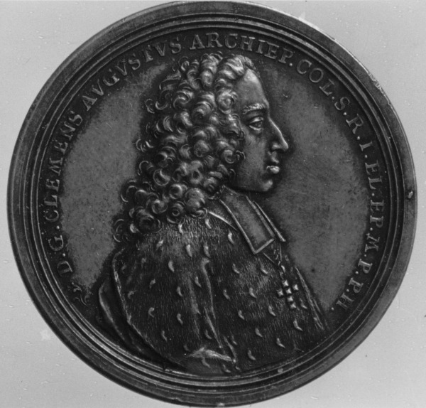Vorderseite einer Silbermedaille mit dem Halbprofil des Fürstbischofs Clemens August von Bayern, die am 9.5.1724 beim Spatenstich zum Max-Klemens-Kanal an die anwesenden Ehrengäste verteilt wurde.