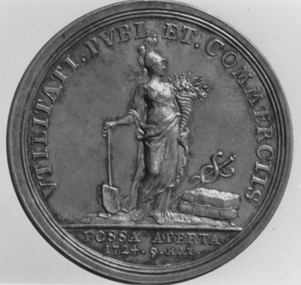 Rückseite: eine stehende Minerva, die Schutzgöttin des Handels, mit Spaten (erster Spatenstich), Füllhorn, Warenballen.