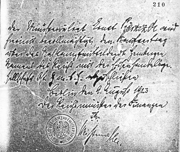 Ministerialrat Ernst Piesczcek wurde bevollmächtigt, den Kaufvertrag im Namen des Reichsfinanzministeriums zu unterschreiben.