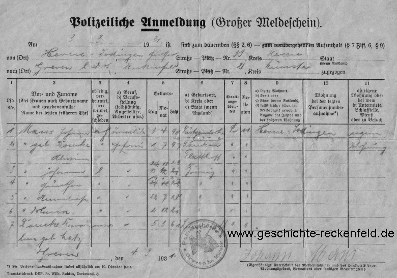 Ein einzigartiges Dokument aus der Besiedlungszeit: Die Anmeldung beim Amt Greven durch die Familie Manß. Seit dem 3. März 1931 wohnt die Familie in Reckenfeld