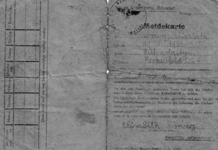 1946: Eine Meldekarte einer in Reckenfeld arbeitenden Frau. Zu diesem Zeitpunkt belegten polnische Displaced Persons einen Großteil von Reckenfeld