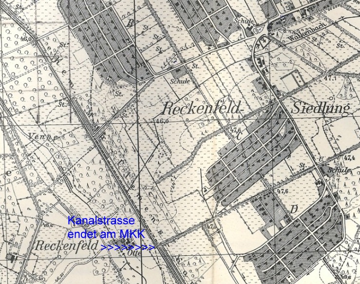 Wann wurde die Kanalstraße als auch der Wittlerdamm angelegt? Wahrscheinlich ist, dass beim Bau des MKK diese Verbindung zur Bauerschaft Herbern mit angelegt wurde, um den dortigen Bauern die Möglichkeit zu geben, dort hinzugelangen. Ein weitere Begründung: Der von Herbern kommende Weg endet am MKK.