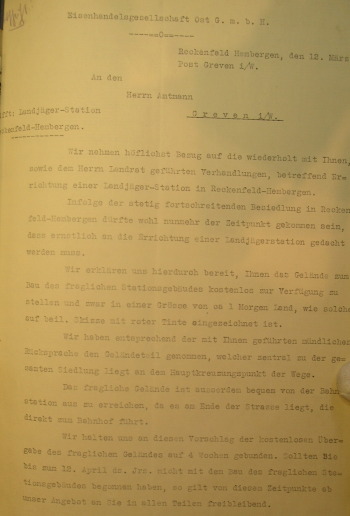 Die Einwohner Reckenfelds wollten einen 'eigenen' Polizeiposten. Das geht aus einem Zeitungsartikel aus dem Jahr 1927 hervor: Ein Siedler schrieb als Naturfreund: "Holzdiebe sind in den Reckenfeld-Hembergen umsäumenden Waldbeständen an der Arbeit. Wo immer sie Holz antreffen, wird es abgeschlagen, so daß große Lücken entstehen. Mit welcher Dreistigkeit sie ans Werk gehen, sieht man daran, daß sie nicht einmal 100m von den Wohnungen entfernt ihr Diebeshandwerk verrichten. [...] Die Einwohner der Gartenstadt Reckenfeld-Hembergen sollten im eigenen Interesse ein wachsames Auge auf die in seiner Nähe liegenden Waldbestände haben, um dem skandalösen Treiben eine Ende zu bereiten. Die maßgebende Behörde sollte Polizeibeamte in Reckenfeld-Hembergen stationieren. [...]" Die EHG machte Vorschläge für einen Polizeiposten in ReckenfeldAm 12. März 1927 schrieb die EHG an Amtmann Hueske: "Wir nehmen Bezug auf die verschiedenen Unterredungen mit Ihnen und dem Herrn Landrat betreffend einer Landjägerstation in Reckenfeld-Hembergen. [...] Wir erklären uns bereit, Ihnen das Gelände (1 Morgen) zum Bau eines Stationsgebäudes kostenlos zur Verfügung zu stellen. [...]" (Anmerkung: Es handelte sich hierbei um das westlich gelegene Eck-Grundstück zwischen der heutigen Industriestraße und der Bahnhofstraße. Auf diesem Grundstück bauten die Familie Imm 1927 ihre ‚Villa', die auch heute (2007) noch steht).Das Amt Greven reagierte auf den Vorschlag der Besitzerin ReckenfeldsAmtmann Hueske griff den Vorschlag der EHG auf und schlug dem Landrat vor, einen Neubau - wie von der EHG vorgeschlagen - anzunehmen, da die bisherige Wohnung des Oberlandjägers Peters in Greven nicht ausreichend und auch noch feucht war. [...] Für den 12. April 1927 ordnete Hueske eine Besichtigung in Reckenfeld für Bedienstete des Amtes und für die EHG an: Es sollen teilnehmen: Er selbst, Peters und die EHG. Am selben Tag schrieb Hueske über die stattgefundene Besichtigung: "Es nahmen teil: Oberregierungsrat Pächter, Landrat Graf von Westphalen, Oberbaurat Borchers, Baurat Arnzen, Direktor Wilde (EHG), Landjäger Peters. Gegen den angebotenen Platz sei an sich nichts einzuwenden, ist die Errichtung eines neuen Gebäudes jedoch erschwinglich? Es war darauf die Einrichtung einer Mietwohnung im Wohlfahrtsgebäude oder in einem 300qm großen Schuppen erwogen worden. Ich habe vorgeschlagen, einen kleinen günstig gelegenen Schuppen in A von 70qm von der EHG unentgeltlich oder doch zu einem billigen Preis zu übernehmen und diesen ordnungsgemäß auszubauen. [...]" Zur Übernahme und Fertigstellung kam es dann auch. In dem Schuppen A 45 wurde die erste Polizeistation in Reckenfeld eingerichtet. In welchem Jahr und Monat diese fertiggestellt wurde, ist nicht überliefert. Welcher Polizist war zuständig für Reckenfeld bis Mitte der 1930er Jahre?
