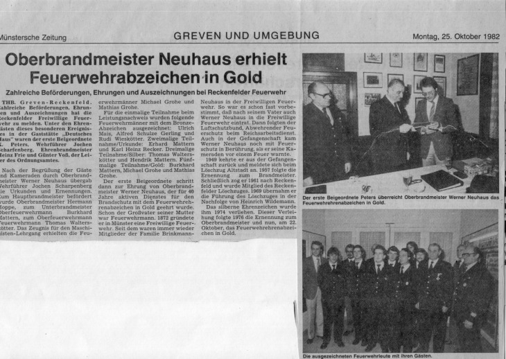 Der Innenminister des Landes Nordrhein-Westfalen verlieh am 1.8.1982 das Feuerwehr-Ehrenzeichen in Gold für 40-jährige treue Pflichterfüllung im Dienste Feuerwehr.