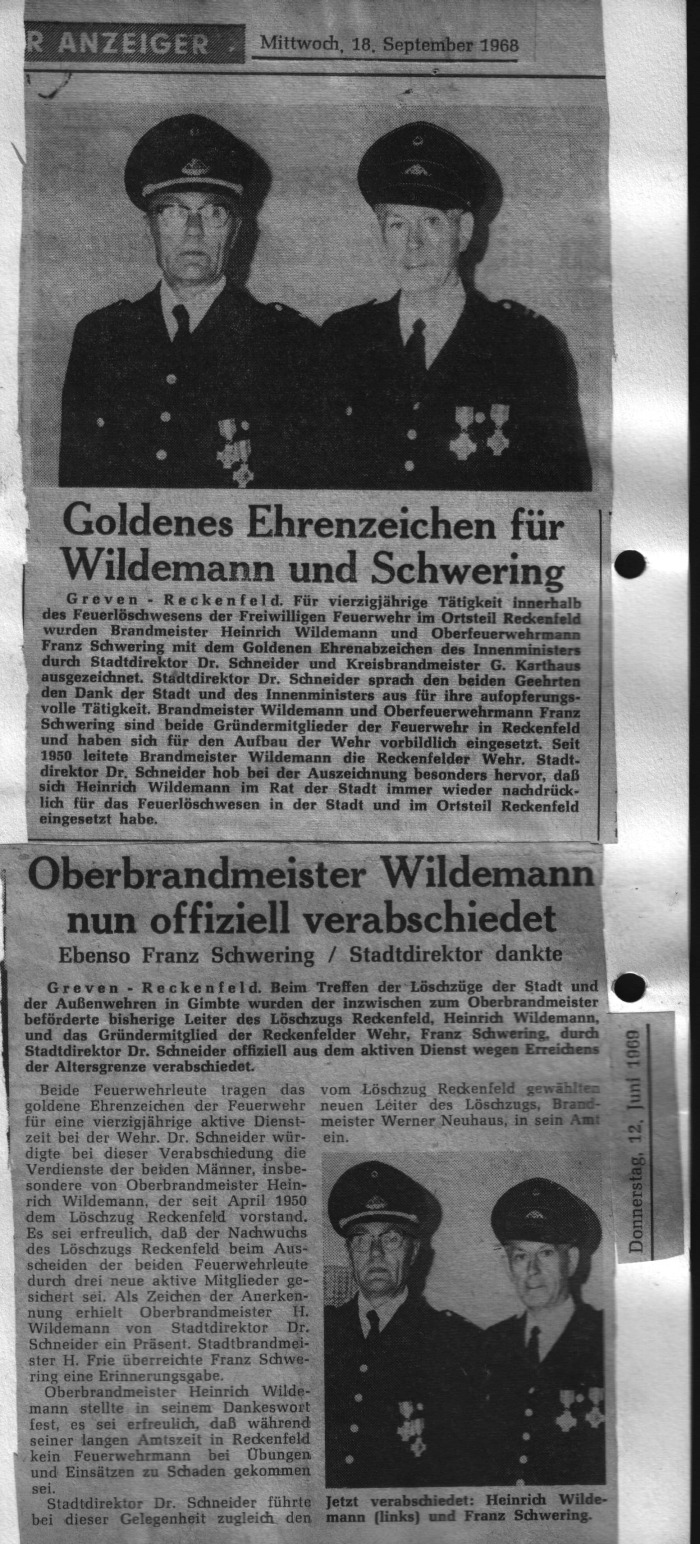 Am 1. August 1968 erhielt Heinrich Wildemann (Dienstgrad Brandmeister) vom Innenminister des Landes NRW das "Feuerwehr-Ehrenzeichen" in Gold.