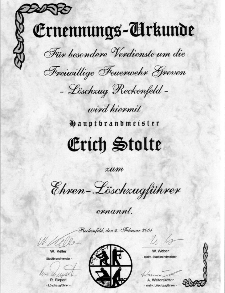 Erich Stolte wird im Jahr 2001 zum Ehrenlöschzugführer ernannt.