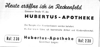 Wie es nun auch gewesen sein mag, trotz der Einrichtung der Autobuslinie in die Innenstadt wuchs bei der ständig steigenden Zahl der Reckenfelder Bevölkerung der Wunsch, auch im eigenen Ortsteil eine Apotheke zu haben. Am 14. April 1959 ging dieser über Jahrzehnte hinweg gehegte Wunsch endlich in Erfüllung. An diesem Tage eröffnete nämlich der aus Herne stammende Apotheker Günther Loges zusammen mit seiner Frau Marlis in Reckenfeld die "Hubertus-Apotheke".