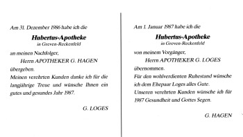 Die "Hubertus-Apotheke" befindet sich seit dem Juli 1968 im Hause Grevener Straße Nr. 5- Von hier aus versorgte Günther Loges die Reckenfelder Bevölkerung bis Ende Dezember 1986 mit Arzneimitteln. Seit dem 1. Januar 1987 hat diese Aufgabe der Apotheker Gerd Hagen übernommen.