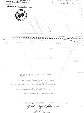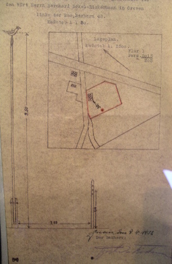 Am 8.6.1928 stellt der Architekt den Antrag auf Genehmigung zum Bau und Betrieb einer Schankwirtschaft für Bernhard Bokel gt. Rickermann, in dem Haus an der Bahnhofstraße. Die Firma Hatke, Greven, ist der Bauunternehmer.