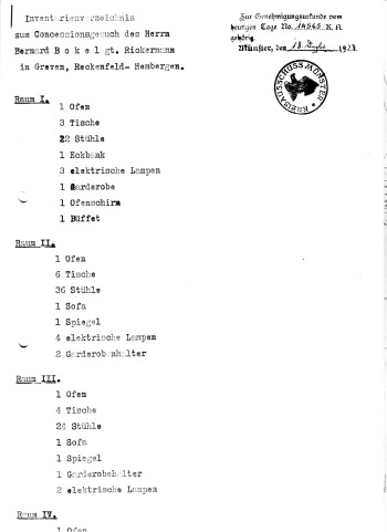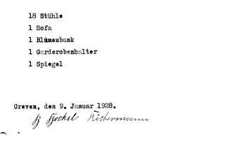 "Ein Beauftragter der Engländer gab uns Bescheid. Die Zwangsräumung des gesamten Hauses erfolgte am 16. Mai 1945. Wir hatten zwei Tage Zeit zum Auszug aus dem Haus. Wir sind bei Bokel-Rickermann, Herbern 6, untergekommen. Bei uns in Reckenfeld lebten ca. 50-60 Polen im Saal. Ende 1949: Freigabe des Hauses und Wiederaufbau. Der Saal zu Hause wurde 1952 wiederhergestellt. Wir wohnten während der Renovierungsarbeiten im Lager der Genossenschaft. Entschädigung erhalten: 20% von den 52.000 Mark an Kosten."