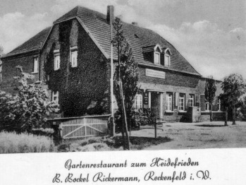 Eine Zeitung im Jahr 1954: "Eng verbunden mit dem Familienleben ist der Aufbau der Gastwirtschaft "Zum Heidefrieden". Die Anregung zum Bau dieser Gaststätte ging vom damaligen Bürgermeister Greven l.d.E. - Howest-Engberding - aus, der am Bahnhof Reckenfeld (damals noch Hembergen) eine Gastwirtschaft wünschte, die dann im Sommer des Jahres 1928 durch Bernhard Bokel-Rickermann erbaut wurde. Zugleich wurde eine Nebenstelle der Bäuerlichen Bezugs- und Absatzgenossenschaft Greven durch ihn errichtet und noch im gleichen Jahr errichtet wurde. Nahezu in der Heide wurde die Gastwirtschaft gebaut, daher auch der Name. [...]"