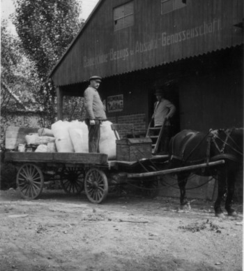 Übernahme der Geschäftsführung der Zweigstelle der Bäuerlichen Genossenschaft Greven durch Bernhard Bokel-Rickermann am 1. Juli 1928: "Im ersten Geschäftsjahr hatte die Genossenschaft einen Umsatz von 100.000 Mark." Und weiter: "Die schwerste Zeit war die Zeit des DP-Lagers als die Polen die Bahnhofstraße sperrten. Die Zweigstelle wurde deshalb auf den elterlichen Bauernhof von Bokel-Rickermann verlegt. Danach errichtete man ein Mühle für Futtergetreide und ein Lager für Dieseloel um die Traktoren versorgen zu können."