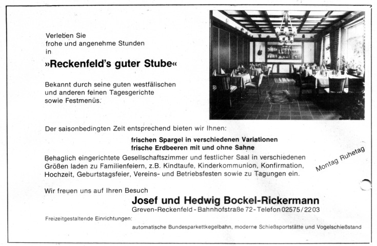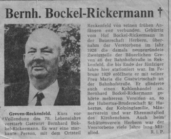 In einer Aufstellung aus dem 1931 "Behändigungsliste betr. Alkoholausschanks und Brotverkauf in Gast- und Schankwirtschaften" werden für Reckenfeld am 15.1.1931 aufgeführt: Leonhardt, Geitz und Berlage. Bokel-Rickermann wird unter Herbern genannt. (Anmerkung: Ob auch Rickermann Brot verkauft hat, ist nicht weiter belegt.)