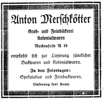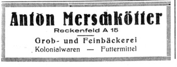 1928 bzw. 1929 bot Anton Merschkötter den Reckenfeldern Flaschenbier zum Verkauf an, einige Zeit danach baute er in seinem 30m-Schuppen eine Grob- und Feinbäckerei, um Brot- und Backwaren zu verkaufen. 1932 wurden noch weitere Lebensmittel (Kolonialwaren) angeboten.
