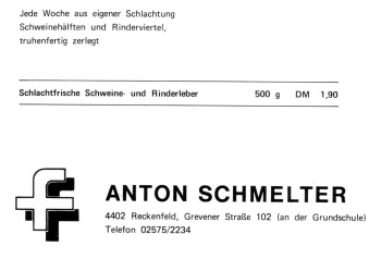 Sohn Anton Schmelter übernahm den danach den ehemaligen elterlichen Betrieb, und als die Verkaufszahlen immer mehr sanken, stellte er sich um und verkaufte nur noch Pferdefleisch. Seine Frau Marianne stand ihm zur Seite und ab dann (1990) gab es (wieder) eine Pferdemetzgerei in Reckenfeld.