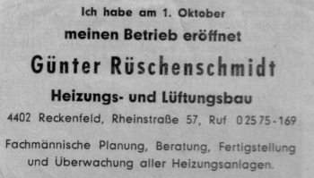 Nach diesem Start war Rüschenschmidt 1½ Jahre allein im seinem Unternehmen. Gelegentlich hatte sein Vater Emil Rüschenschmidt - weil er Schichtdienst bei der Bahn hatte -, schon mal ein paar Stunden mitgeholfen. Eine 'Nachbarsfrau' hatte die Buchführung übernommen, die dann zu einem späteren Zeitpunkt seine Frau Annemarie bewältigte. 1971 wurde der erste Monteur eingestellt.
